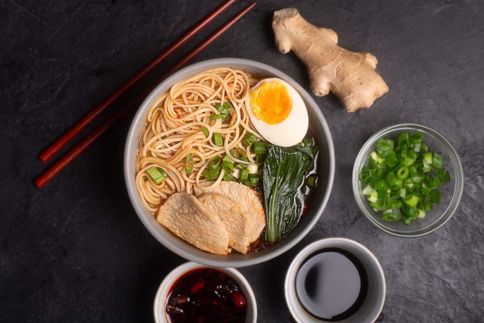 - Przygotowanie bulionu: W dużym garnku umieść kości wieprzowe, kości kurczaka, szynkę, imbir i por. Zalej wodą i gotuj na wolnym ogniu przez kilka godzin, aż bulion będzie bogaty i aromatyczny. Przecedź bulion i pozwól mu ostygnąć. Następnie umieść go w lodówce, aby tłuszcz stężał na powierzchni.