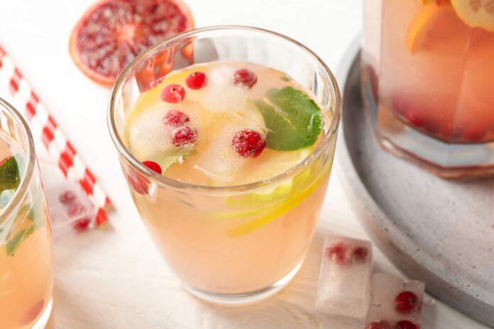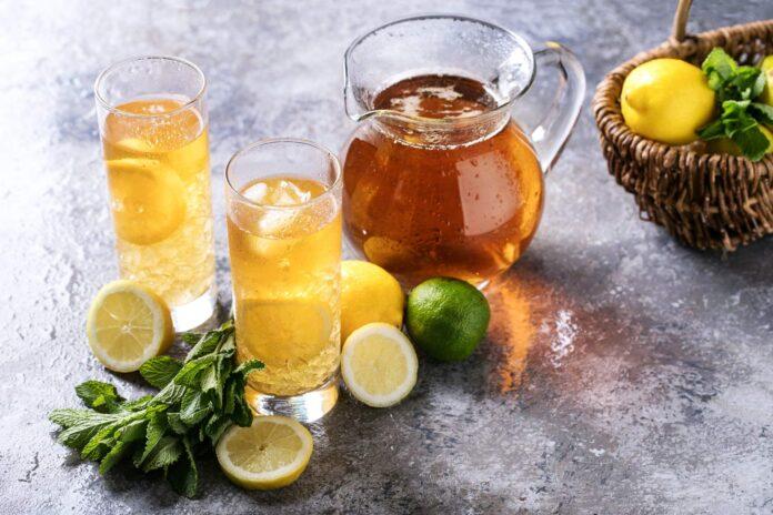 - Przelej sok z cytryny do schłodzonej esencji herbacianej. Dodaj plasterki owoców oraz gałązki mięty. Dodaj kostki lodu i dobrze wymieszaj.
