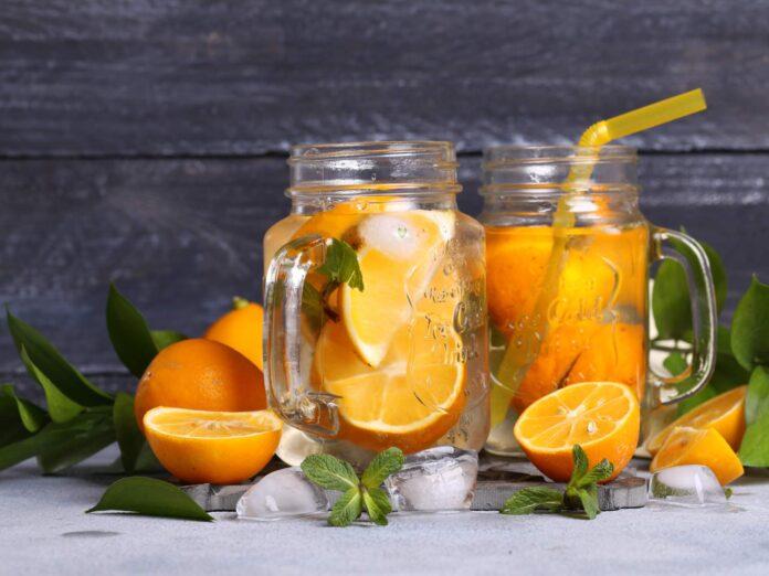 - Umyj owoce i zioła. Przekrój jedną cytrynę na pół i z obu połówek wyciśnij sok do szklanki. Dwie pozostałe cytryny pokrój w plasterki. Pokrój również pomarańczę na plasterki.